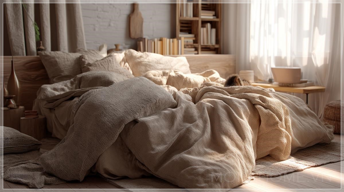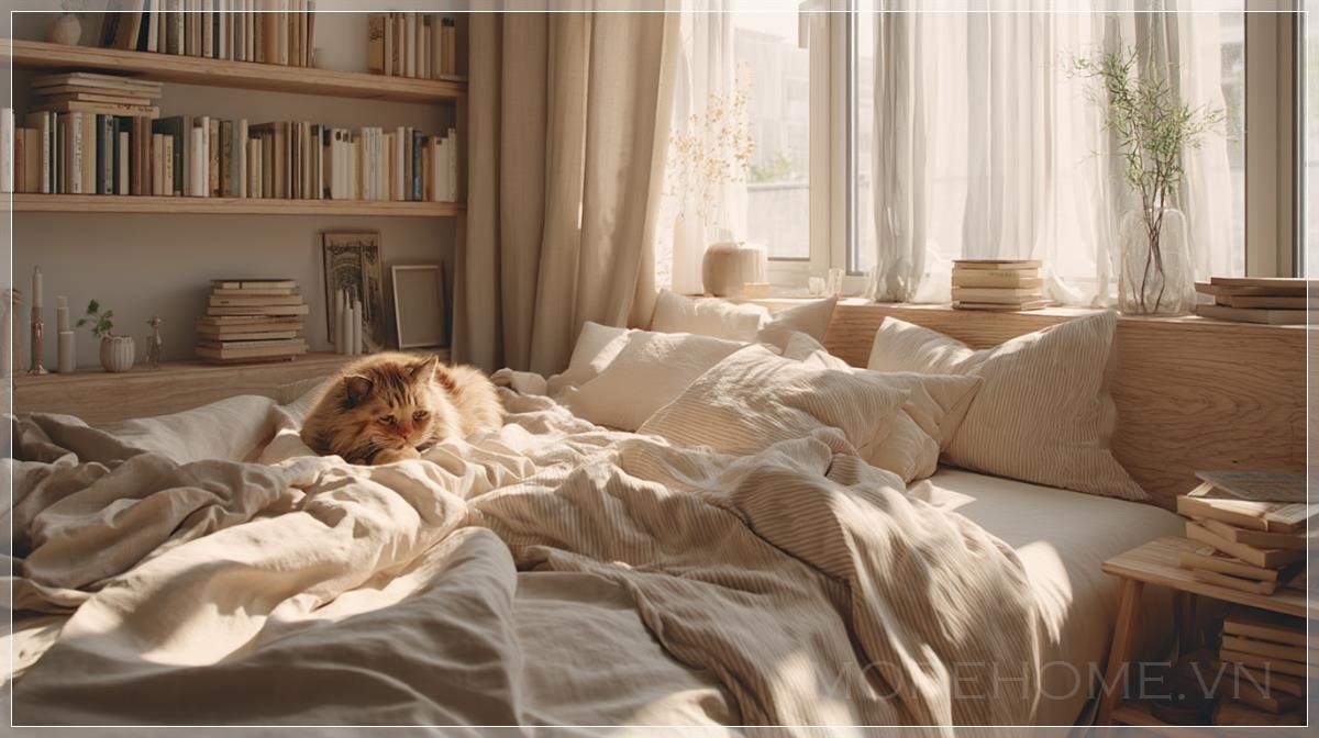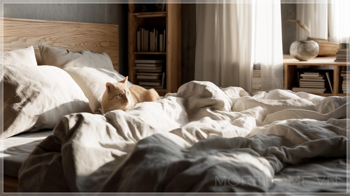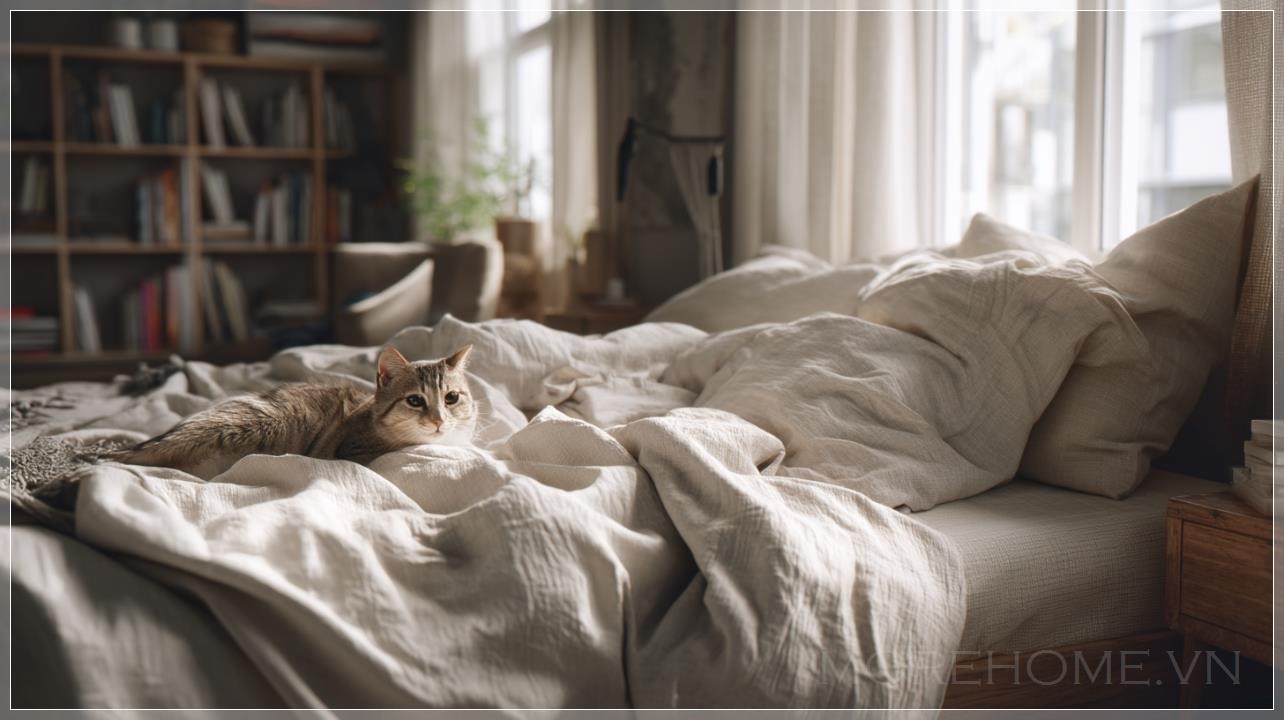 Ảnh chụp phong cách sống siêu thực, độ phân giải cao của một phòng ngủ ấm cúng ngập tràn ánh sáng tự nhiên mềm mại. Một con mèo nằm trên giường và chiếm phần lớn bức ảnh. Bộ chăn ga cotton cực kỳ mềm mại với các kết cấu và nếp gấp rõ ràng, mang lại cảm giác ấm áp và thoải mái. Cảnh vật bao gồm nội thất gỗ tự nhiên, rèm vải lanh và giá sách trong nhà, làm tăng thêm không gian sống mời gọi và yên tĩnh. Bức ảnh giống như một bức ảnh nội thất thực tế, với ánh sáng chuyên nghiệp, bảng màu tự nhiên mềm mại và sự hiện diện chân thật của con người tạo cảm giác chân thực và đầy cảm xúc.