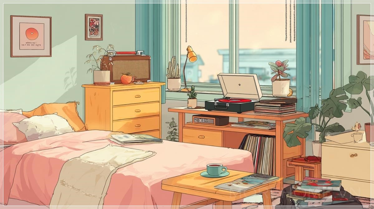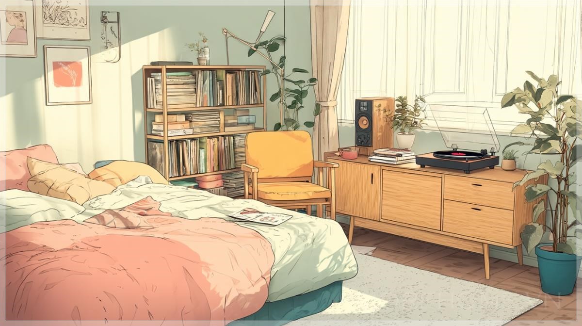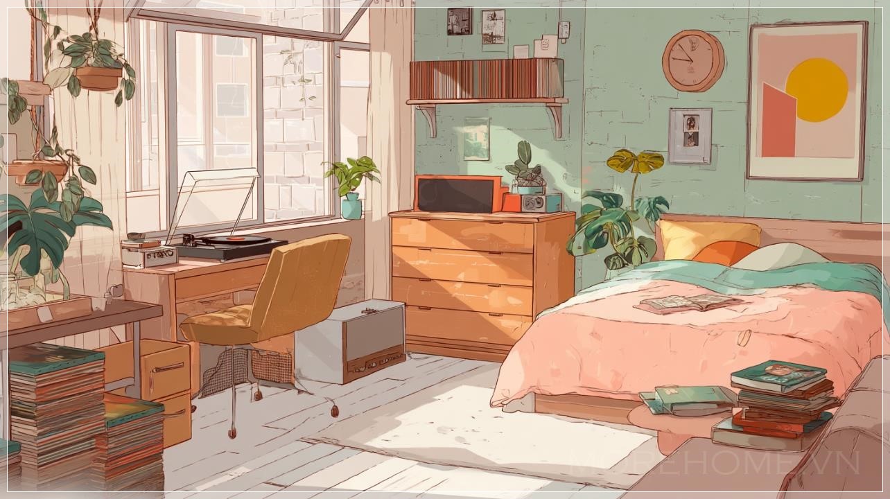 Một phòng ngủ theo phong cách lofi ấm cúng, với một chiếc giường mềm mại được trang trí bằng bộ chăn ga gối màu pastel. Bàn trang điểm bằng gỗ đặt cạnh giường, kết hợp với ánh sáng ấm áp, dễ chịu. Màu sắc chủ đạo là những tông màu nhạt và nhẹ nhàng, cùng với các kết cấu mềm mại như vải lanh, nỉ. Các cây xanh được bố trí khắp phòng, tạo không gian tươi mới. Một chiếc ghế đọc sách thoải mái được đặt gần cửa sổ, nơi ánh sáng tự nhiên chiếu vào. Một chiếc máy nghe đĩa hay những cuốn sách được đặt trên bàn nhỏ gần đó, làm nổi bật bầu không khí thư giãn, nhẹ nhàng của căn phòng. Toàn bộ không gian mang đến một cảm giác bình yên, thư giãn, phù hợp với phong cách sống chậm.
