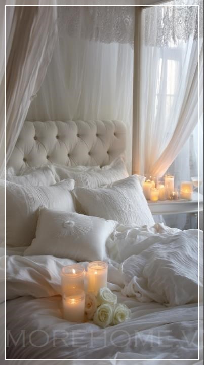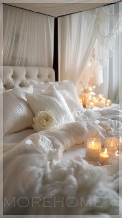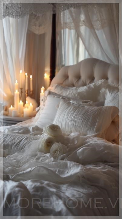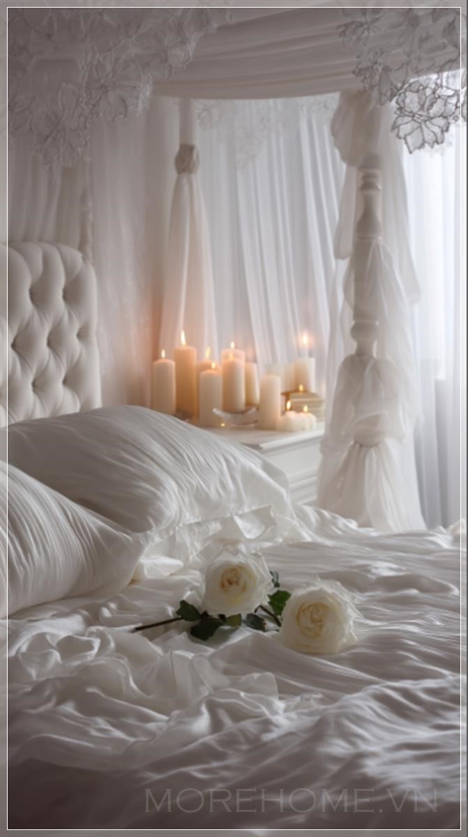 Chăn ga gối lụa trắng tinh khiết, lớp lớp kết cấu trắng, chăn mềm nhăn nheo, hoa hồng trắng trên gối, nhiều nến tạo ánh sáng ấm áp, mái vòm ren trên giường, đầu giường bọc nhung sang trọng, không khí yên bình và thư giãn, phong cách xa hoa tối giản cao cấp.