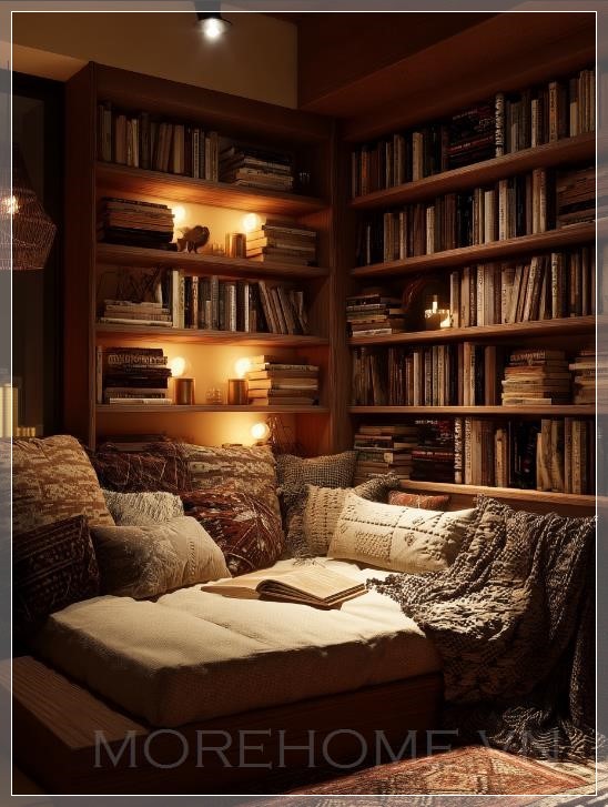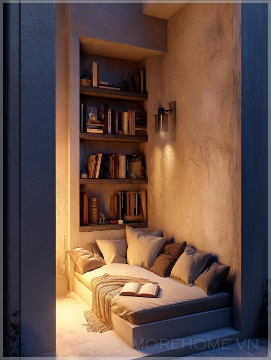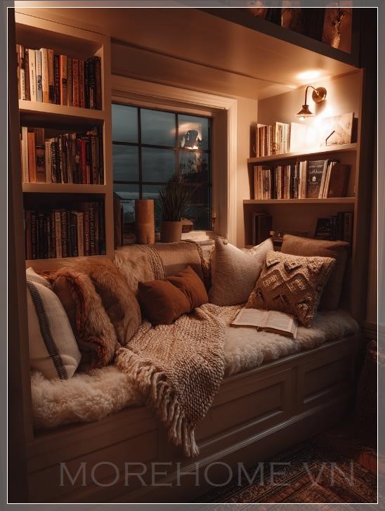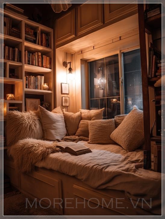 Một góc đọc sách ấm cúng, với chiếc giường dài tích hợp đầy gối ôm, một kệ sách nhỏ chứa đầy sách vở, ánh sáng ấm áp, khung cảnh buổi tối, mang vẻ đẹp thẩm mỹ, nghệ thuật và theo phong cách cottagecore.