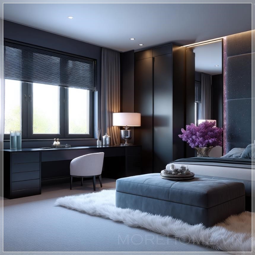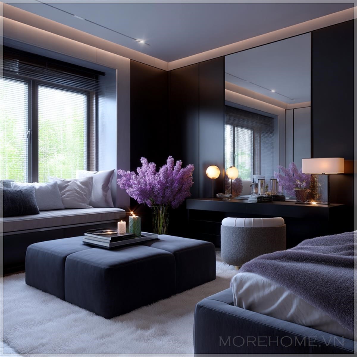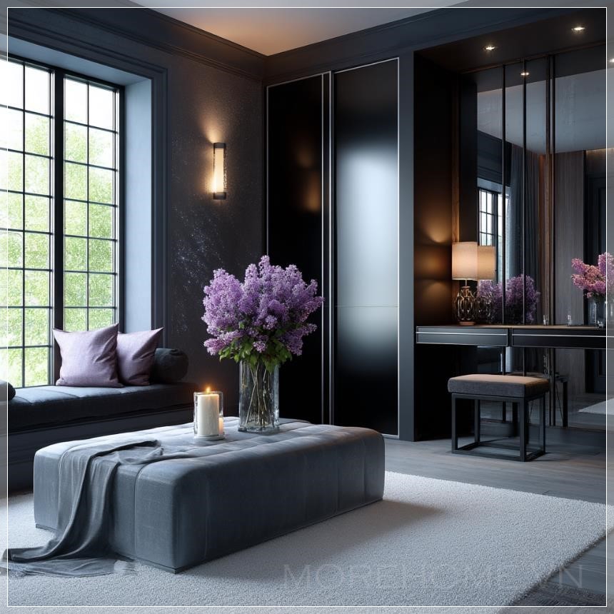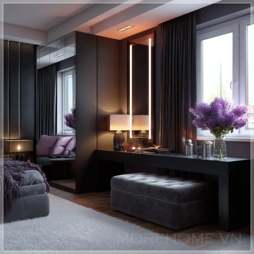 Một căn phòng sang trọng và đẹp mắt, nội thất tối giản với gam màu đen xám, cửa sổ lớn, bàn trang điểm màu xám đen và ghế băng, giường sang trọng, đôn mềm mại, thảm lông màu trắng, đèn trang trí đẹp mắt, hành lang vào phòng, hoa tử đinh hương trong bình, ánh sáng mặt trời chiếu vào, không gian rộng rãi, ánh sáng đỏ, ánh bạc lấp lánh, thiết kế nội thất, HDR, 8K.