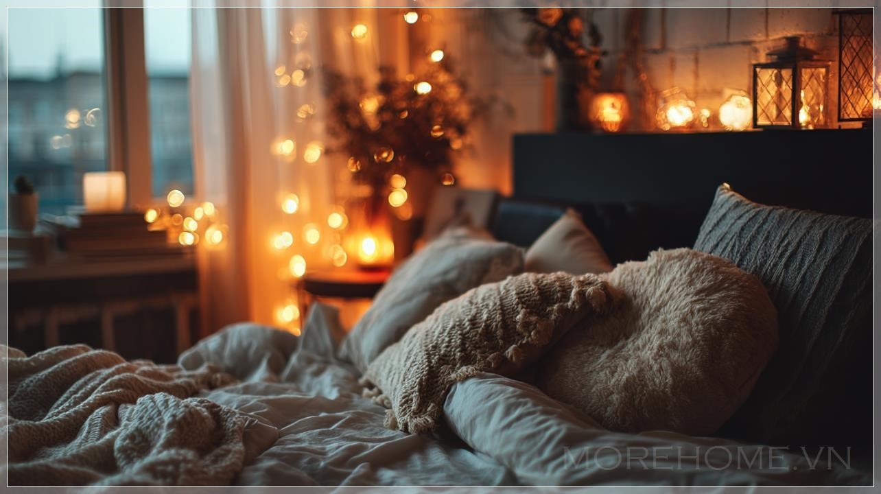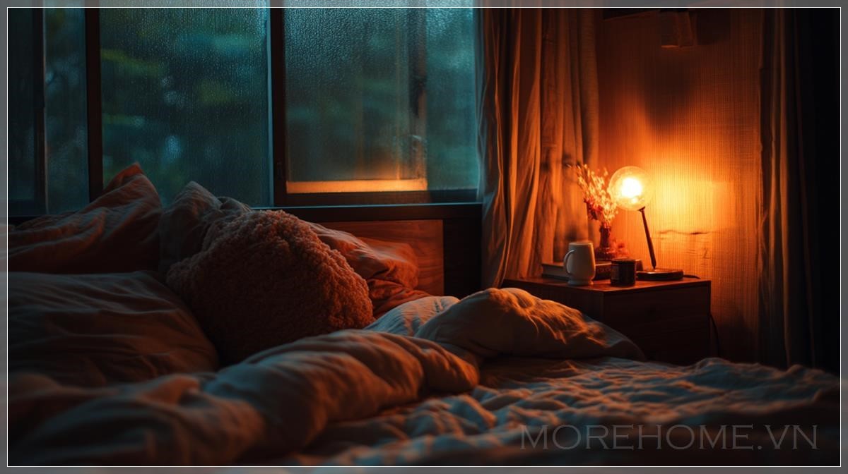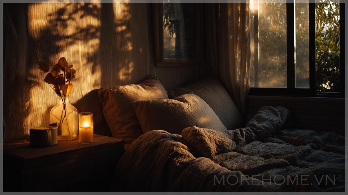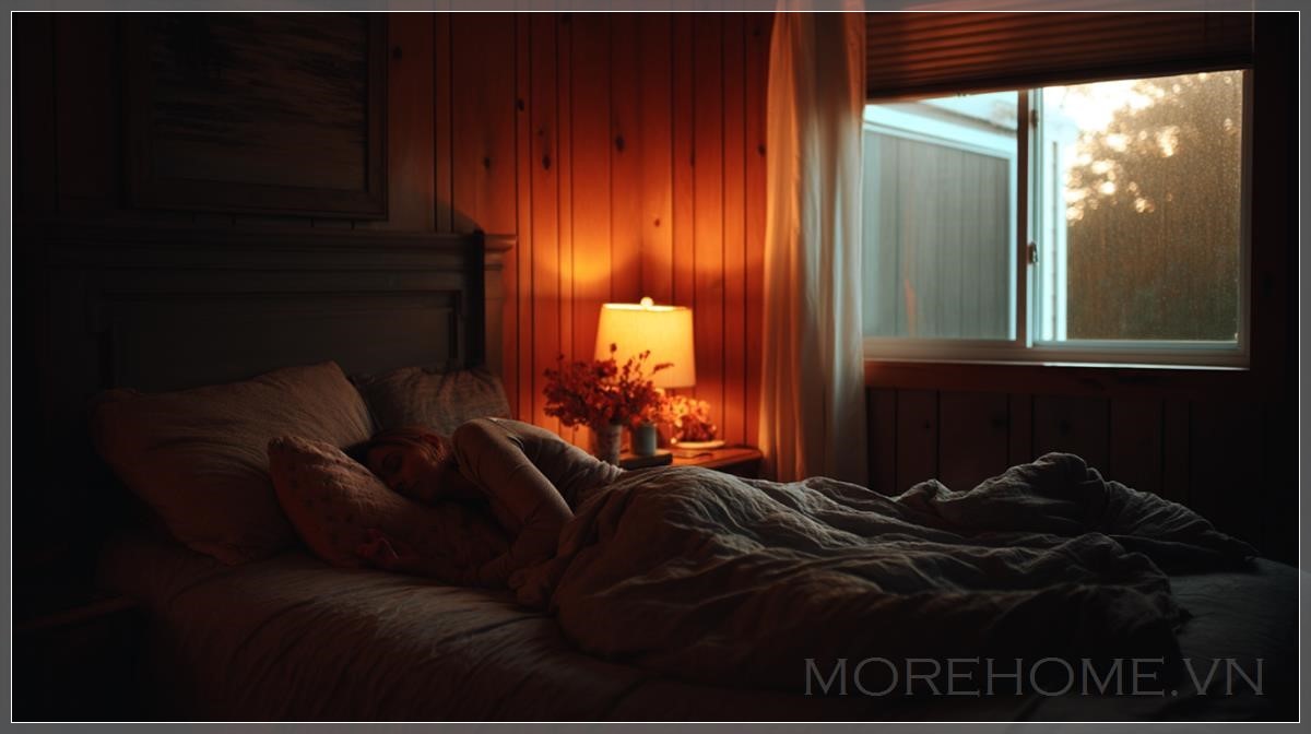 Cảnh ngủ yên bình trong phòng ngủ ấm cúng, ánh sáng ấm áp, khái niệm thư giãn.
